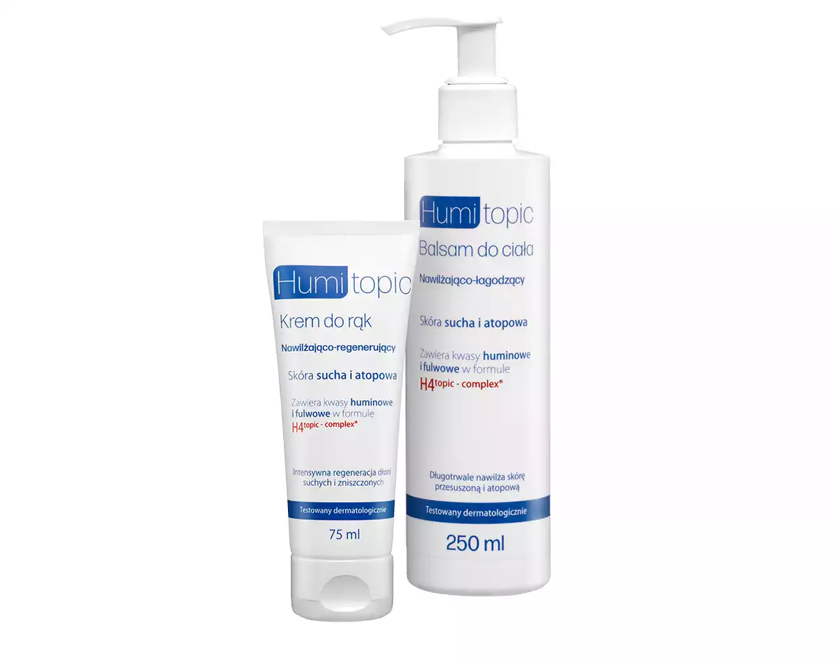 Połączenie kwasu huminowego i fulwowego zapewnia osiągnięcie maksymalnych korzyści z zastosowania substancji humusowych. Kwas fulwowy jako doskonały antyoksydant ma właściwości przeciwstarzeniowe, uelastycznia skórę oraz poprawia jej nawilżenie. Frakcja kwasu huminowego ma właściwości przeciwzapalne, przeciwalergiczne, a także wspomagające gojenie ran. Formuła substancji humusowych H4topic - complex® zawarta w produktach Humitopic zapewnia wielokierunkowe działanie oraz doskonałą pielęgnację skóry atopowej.